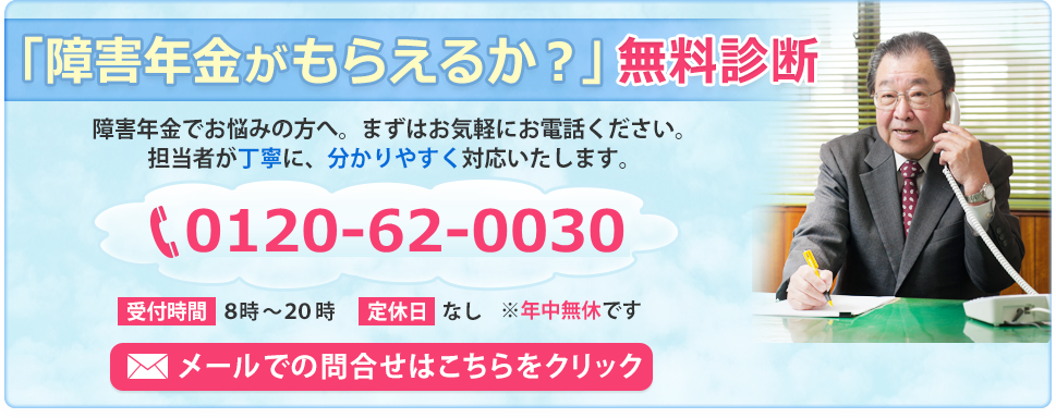 障害年金がもらえるかどうか?は、無料出張相談で診断できますので、お気軽にお問い合わせください。